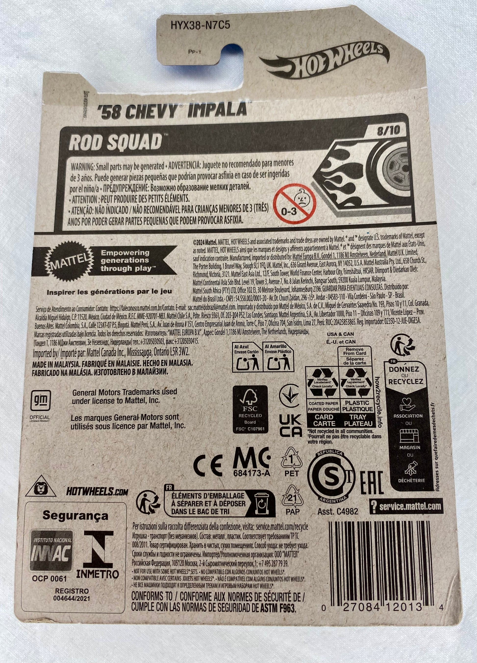 This ’58 Chevy Impala from Hot Wheels’ Rod Squad series (111/250) is an absolute standout — a lowrider masterpiece finished in deep metallic purple with razor-sharp pinstriping and clean chrome lines that scream custom culture. With its aggressive stance, whitewall-style wheels, and that iconic front end, this car doesn’t just roll — it cruises.